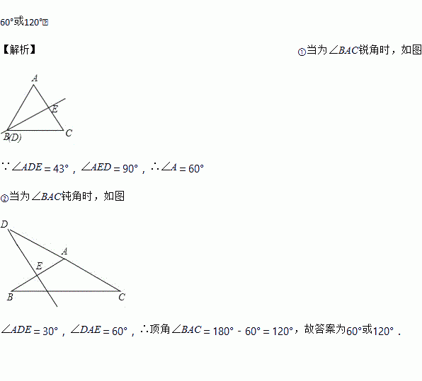 等腰三角形一腰的垂直平分线与另一腰所在的直角夹角为30°,则顶角的度数______.