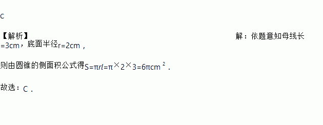 C 【解析】【解析】 依题意知母线长=3cm,底面半径r=2cm, 则由圆锥的侧面积公式得S=πrl=π×2×3=6πcm 2. 故选:C.