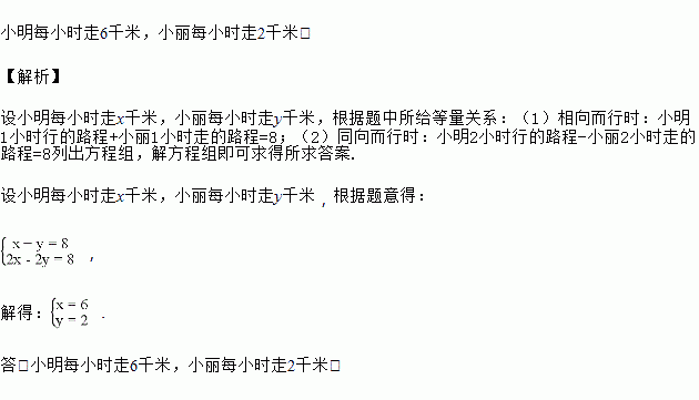小明和小丽两人相距8千米,小明骑自行车,小丽步行,两人同时出发相向而行,1小时相遇;若两人同时出发同向而行,小明2小时可以追上小丽,求小明、小丽每小时各走多少千米?