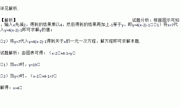 详见解析. 【解析】试题分析:根据图示可知,输入x先减2,得到的结果乘以4,然后得到的结果再加上-1等于y,即y=4(x-2)-1;(1)将x=7代入y=4(x-2)-1即可求解y的值; (2)将y=7代入y=4(x-2)-1得到关于x的一元一次方程,解方程即可求解本题. 试题解析:由图表可得:(x-2)×4-1=y, (1)当x=7时,y=19; (2)当y=7时,...