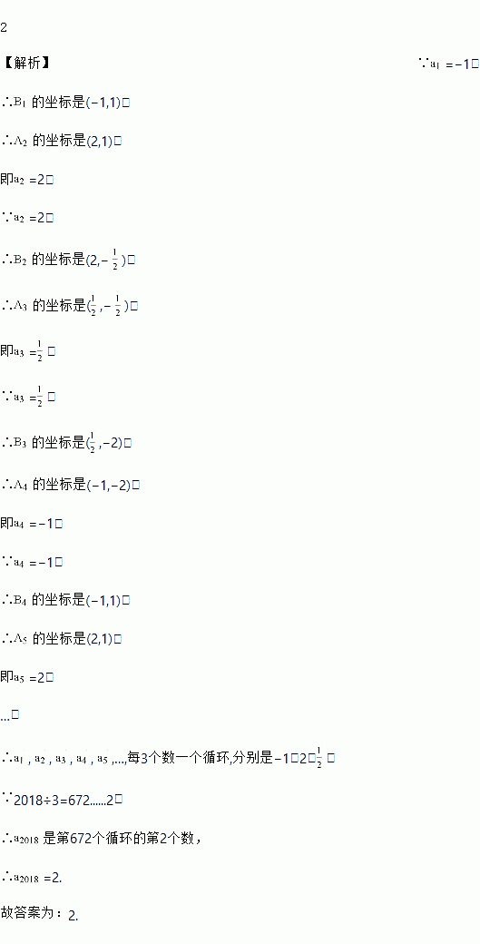上,并且满足A1B1⊥x轴,B1A2⊥y轴,A2B2⊥x轴,B2A3⊥y轴,…,AnBn⊥x轴,BnAn+1⊥y轴,…,记点An的横坐标为an(n为正整数).若a1=-1,则a2018=_______.