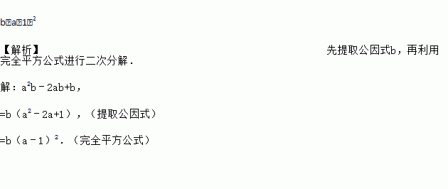 b(a﹣1)2 【解析】先提取公因式b,再利用完全平方公式进行二次分解. 【解析】 a2b﹣2ab+b, =b(a2﹣2a+1),(提取公因式) =b(a﹣1)2.(完全平方公式)