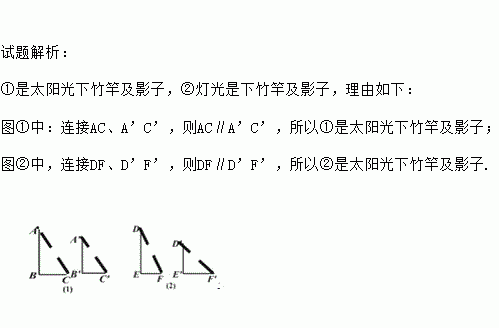 判断图中①和②,哪一幅图是太阳光下的竹竿及影子?哪一幅是灯光下的竹竿及影子?说说你的理由.