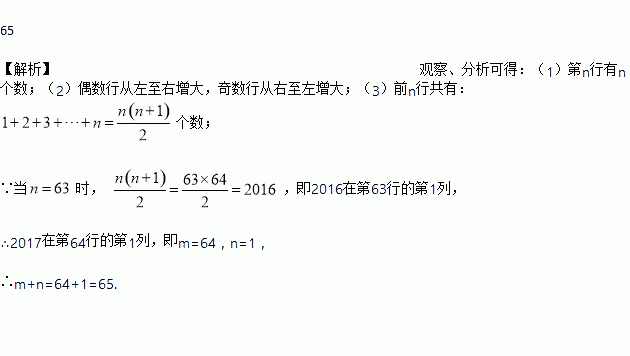 观察规律:例如9位于数阵中第4行的第3列(从左往右数),若2017在数阵中位于第m行的第n列(从左往右数),则m+ n=______.