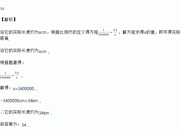 在比例尺的工程示意图上,某铁路的长度约为![]()