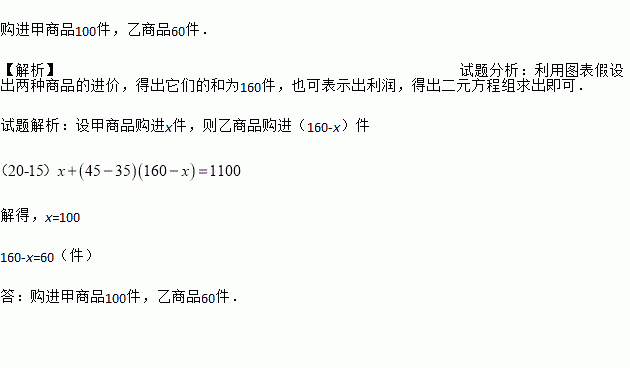购进甲商品100件,乙商品60件. 【解析】试题分析:利用图表假设出两种商品的进价,得出它们的和为160件,也可表示出利润,得出二元方程组求出即可. 试题解析:设甲商品购进x件,则乙商品购进(160-x)件 解得,x=100 160-x=60(件) 答:购进甲商品100件,乙商品60件.