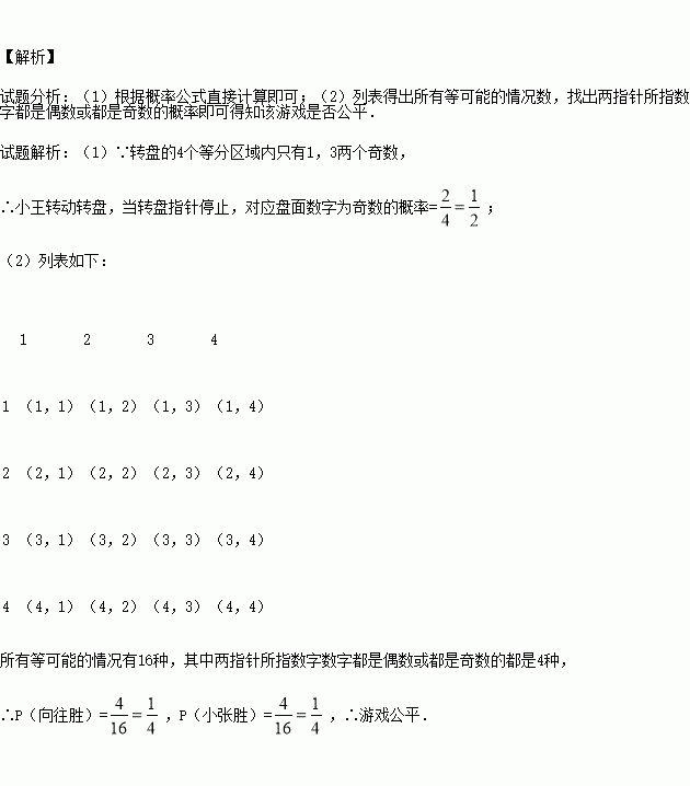 (1)小王转动转盘,当转盘指针停止,对应盘面数字为奇数的概率是多少?