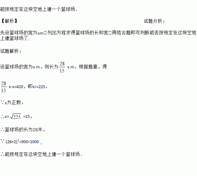 倍,篮球场的四周必须留出1m宽的空地,请你通过计算说明能否按规定在这块空地上建一个篮球场?