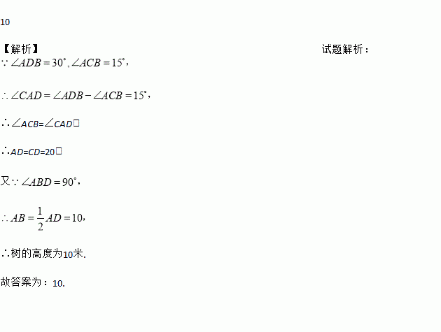 如图,树AB垂直于地面,为测树高,小明在C处测得∠ACB=15°,他沿CB方向走了20米,到达D处,测得∠ADB=30°,则计算出树的高度是__________米.