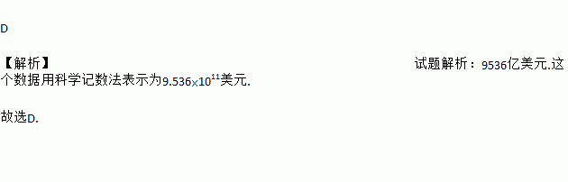 穿过漫漫黄沙,越过滚滚碧涛,一个个蓝图节点正化为繁华的商贸重镇,纵横交织在古老的欧亚大陆.在“一带一路”建设中,贸易合作硕果累累.2016 年,我国与沿线国家贸易总额达到 9536 亿美元.这个数据用科学记数法表示为( )