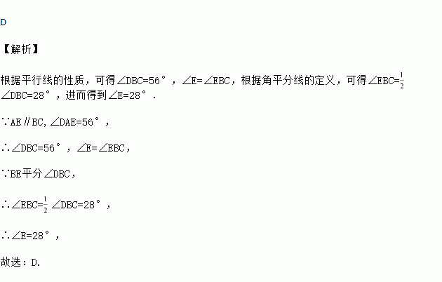 如图,BE平分∠DBC,点A是BD上一点,过点A作AE∥BC交BE于点E,∠DAE=56°,则∠E的度数为( )