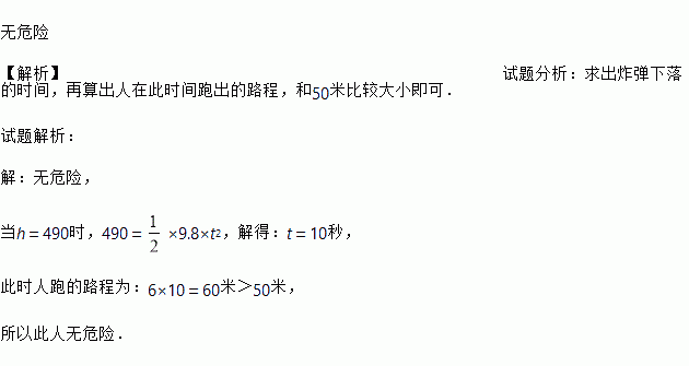 gt2(g表示重力加速度,g取9.8m/s2).某人发现头顶上空490m处有一炸弹自由下落,其地面杀伤半径为50m,此人发现后,立即以6m/s的速度逃离,那么此人有无危险?