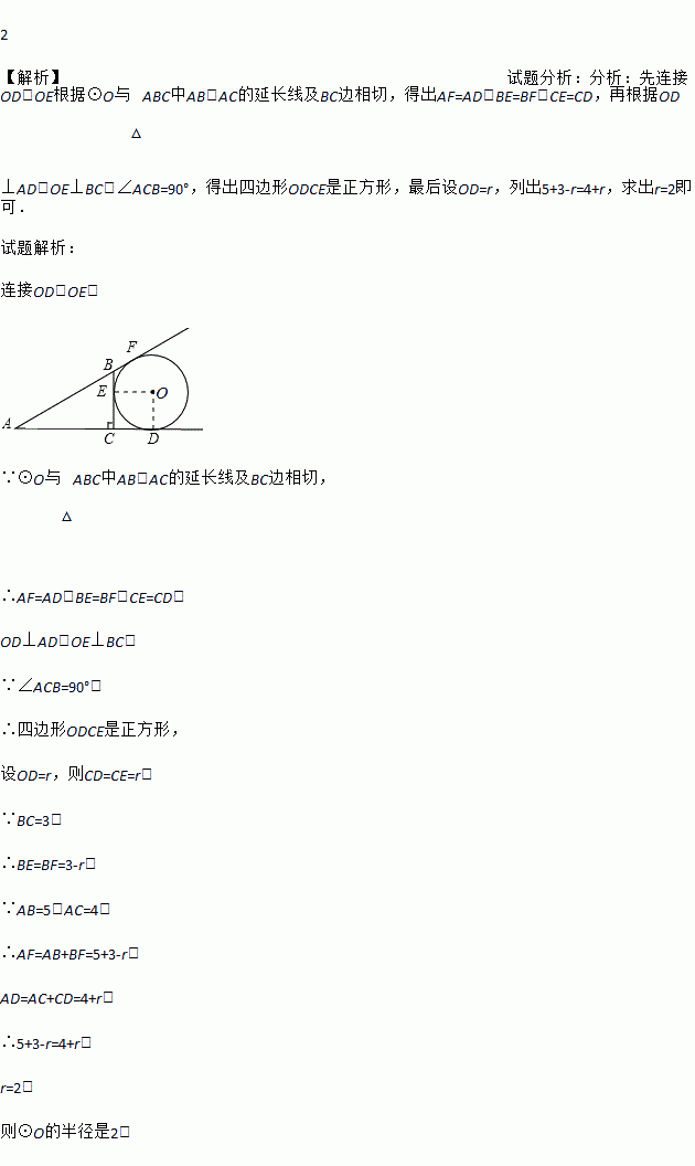 如图,⊙O与△ABC中AB、AC的延长线及BC边相切,且∠ACB=90°,∠A,∠B,∠C所对的边长依次为3,4,5,求⊙O的半径.