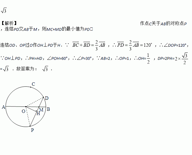 如图,AB是⊙O的直径,已知AB=2,C,D是⊙O的上的两点,且 ,M是AB上一点,则MC+MD的最小值是__________.
