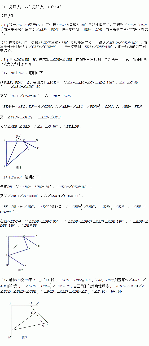(3)如图3,若BE、DE分别五等分∠ABC、∠ADC的邻补角(即∠CDE=