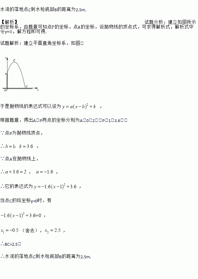 如图,人工喷泉有一个竖直的喷水枪AB,喷水口A距地面2m,喷出水流的运动路线是抛物线. 如果水流的最高点P到喷水枪AB所在直线的距离为1m,且到地面的距离为3.6m,求水流的落地点C到水枪底部B的距离.