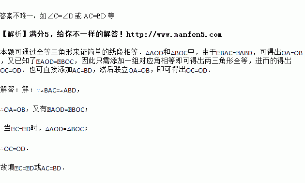 如图,∠BAC=∠ABD,请你添加一个条件:___ ,使OC=OD.