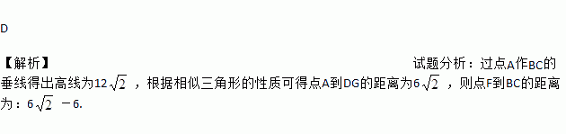 如图,△ABC中,AB=AC=18,BC=12,正方形DEFG的顶点E,F在△ABC内,顶点D,G分别在AB,AC上,AD=AG,DG=6,则点F到BC的距离为.