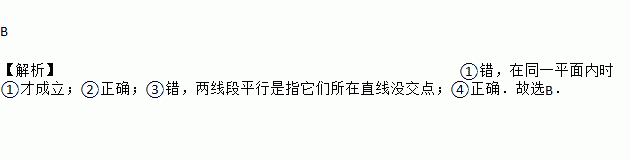 B 【解析】①错,在同一平面内时①才成立;②正确;③错,两线段平行是指它们所在直线没交点;④正确.故选B.