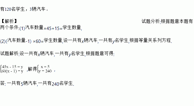 初一级学生去某处旅游,如果每辆汽车坐45人,那么有l5个学生没有座位;如果每辆汽车坐60人,那么空出l辆汽车.问一共多少名学生、多少辆汽车.