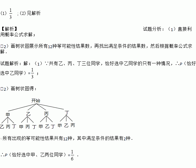 (2)任选两名同学打第一场,请用树状图或列表法求恰好选中甲、乙两位同学的概率。