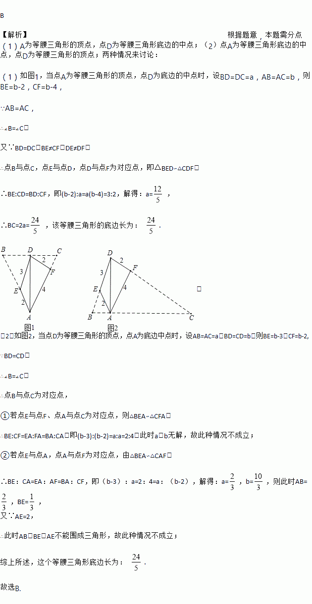 已知有一块等腰三角形纸板,在它的两腰上各有一点E和F,把这两点分别与底边中点连结,并沿着这两条线段剪下两个三角形,所得的这两个三角形相似,剩余部分(四边形)的四条边的长度如图所示,那么原等腰三角形的底边长为( )