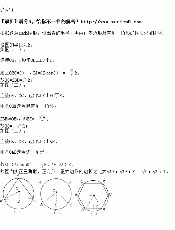 半径相等的圆内接正三角形、正方形、正六边形的边长之比为________.