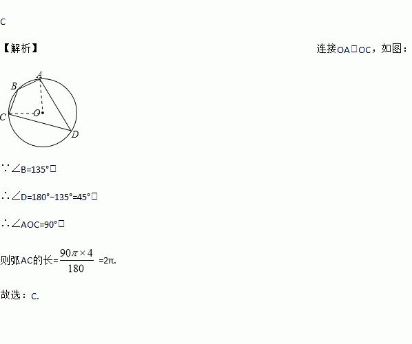 如图,四边形ABCD是⊙O的内接四边形,⊙O的半径为4,∠B=135°,则劣弧AC的长( )