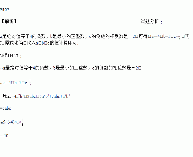 ﹣10. 【解析】试题分析: a是绝对值等于4的负数,b是最小的正整数,c的倒数的相反数是﹣2,可得:a=-4,b=1,c=;再把原式化简,代入a、b、c的值计算即可. 试题解析: ∵a是绝对值等于4的负数,b是最小的正整数,c的倒数的相反数是﹣2, ∴a=-4,b=1,c=. ∴原式=4a2b3﹣2abc﹣5a2b3+7abc+a2b3 =5abc ...