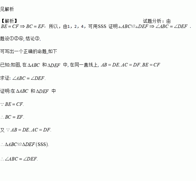 如图,在△ABC和△DEF中,点B,E,C,F在同一直线上,请你再下列4个条件(①~④)中选3个条件作为题设,余下的1个作为结论,写出一个真命题,并证明.①AB=DE;②AC=DF;③∠ABC=∠DEF;④BE=CF.题设:____.结论:____.(填序号)