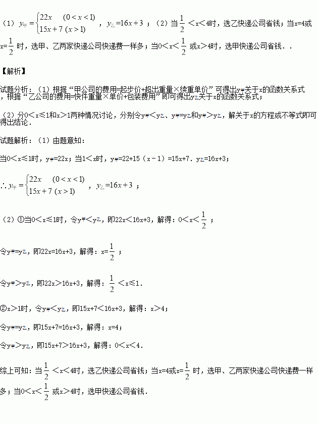 现代互联网技术的广泛应用,催生了快递行业的高速发展.小明计划给朋友快递一部分物品,经了解有甲、乙两家快递公司比较合适.甲公司表示:快递物品不超过1千克的,按每千克22元收费;超过1千克,超过的部分按每千克15元收费.乙公司表示:按每千克16元收费,另加包装费3元.设小明快递物品x千克.