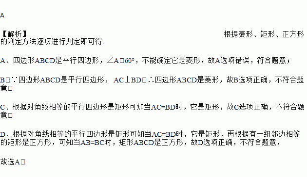 A. 当∠A=60°时,它是菱形 B. 当AC⊥BD时,它是菱形