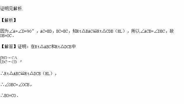 如图,∠A=∠D=90°,AC=DB,AC、DB相交于点O.求证:OB=OC.