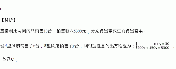 两种型号的风扇,两周内共销售30台,销售收入5300元,![]()