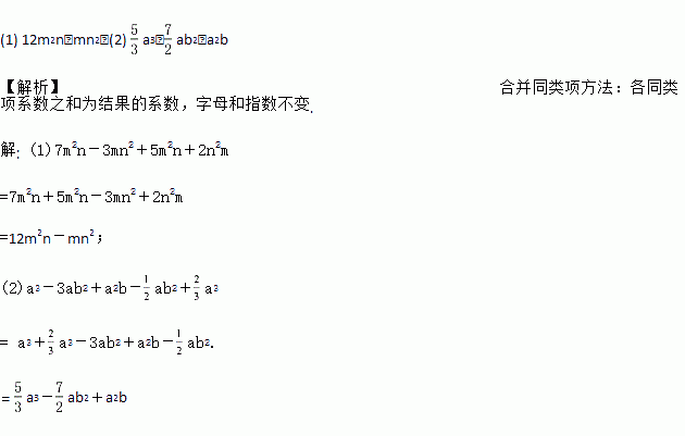 (1)7m2n-3mn2+5m2n+2n2m; (2)a3-3ab2+a2b-ab2+a3.