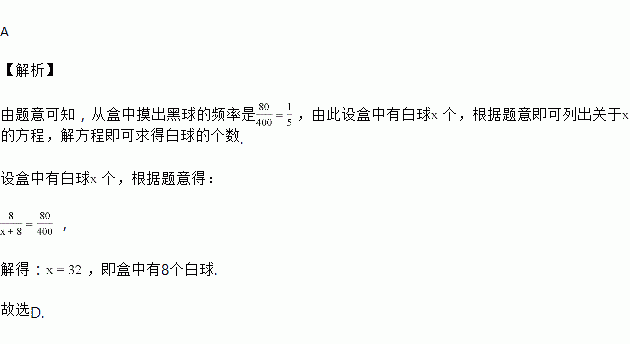 一个密闭不透明的盒子里有若干个白球,在不允许将球倒出来的情况下,为估计白球的个数,小刚向其中放入8个黑球,摇匀后从中随机摸出一个球记下颜色,再把它放回盒中,不断重复,共摸球400次,其中88次摸到黑球,估计盒中大约有白球( )
