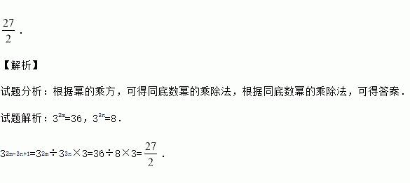 . 【解析】 试题分析:根据幂的乘方,可得同底数幂的乘除法,根据同底数幂的乘除法,可得答案. 试题解析:32m=36,33n=8. 32m-3n+1=32m÷33n×3=36÷8×3=.