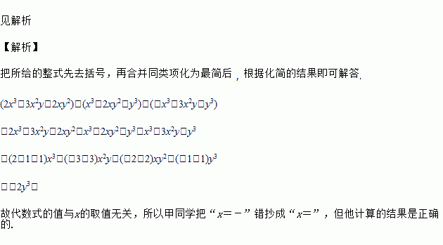 有这样一道题:计算(2x3-3x2y-2xy2)-(x3-2xy2+y3)+(-x3+3x2y-y3)的值,其中x=-