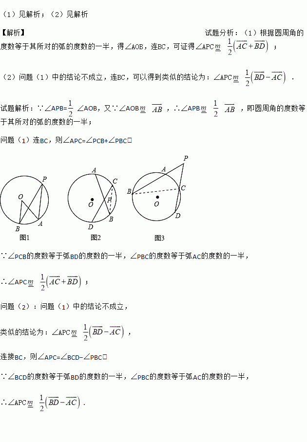 问题(1):如图2,⊙O的两条弦AB、CD相交于圆内一点P,求证:∠APC
