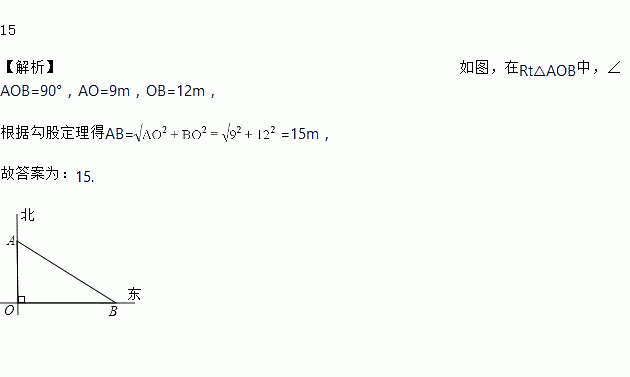 15 【解析】如图,在Rt△AOB中,∠AOB=90°,AO=9m,OB=12m, 根据勾股定理得AB==15m, 故答案为:15.
