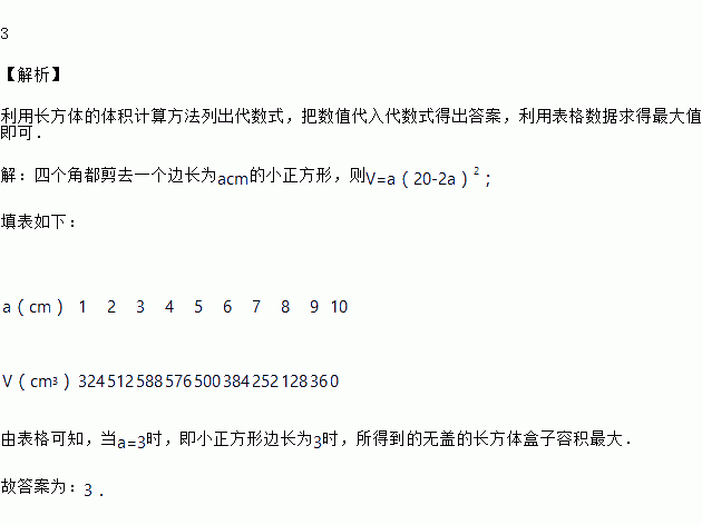 如图,在边长为20的大正方形中,剪去四个小正方形,可以折成一个无盖的长方体盒子.如果剪去的小正方形边长按整数值依次变化,即分别取1、2、3、…、9、10时,则小正方形边长为_____时,所得到的无盖的长方体盒子容积最大.