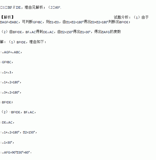(2)若BF⊥AC,∠2=150°,求∠AFG的度数.