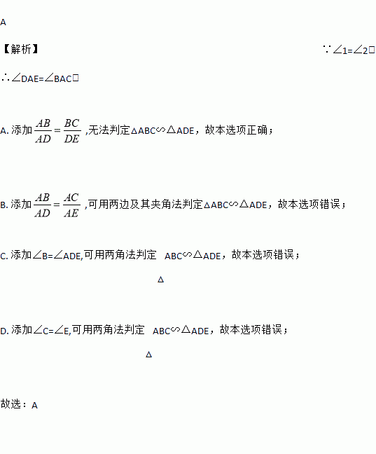 如图,已知∠1=∠2,则添加下列一个条件后,仍无法判定△ABC∽△ADE的是( )