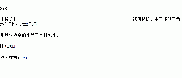 2:3 【解析】试题解析:由于相似三角形的相似比是2:3, 则其对应高的比等于其相似比, 即2:3, 故答案为:2:3.