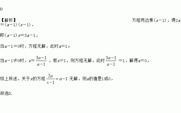 D 【解析】方程两边乘(x-1),得2a=(a-1)(x-1), 即(a-1)x=3a-1, 当a-1=0时,方程无解,此时a=1; 当a-1≠0时,x=,若x=1,则方程无解,此时=1,解得a=0, 综上所述,关于x的方程无解,则a的值是1或0, 故选D.