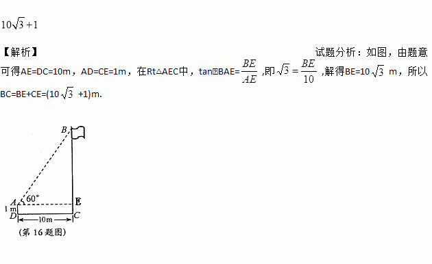 如图,在一次数学课外实践活动中,小聪在距离旗杆10m的A处测得旗杆顶端B的仰角为60°,测角仪高AD为1m,则旗杆高BC为________ m(结果保留根号).