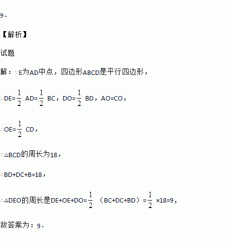 如图,□ABCD的对角线AC、BD交于点O,点E是AD的中点,△BCD的周长为18,则△DEO的周长是_______.