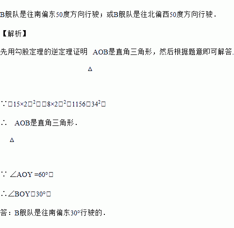 在一条南北向的海岸边建有一港口O,A、B两支舰队从O点出发,分别前往不同的方向进行海上巡查,已知A舰队以15海里/小时的速度向北偏东40°方向行驶,B舰队以8海里/小时的速度向另一个方向行驶,2小时后,A、B两支舰队相距34海里,你知道B舰队是往什么方向行驶的吗?