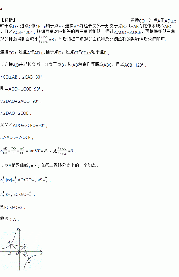在第二象限分支上的一个动点,连接AO并延长交另一分支于点B,以AB为底作等腰△ABC,且∠ACB=120°,点C在第一象限,随着点A的运动,点C的位置也不断变化,但点C始终在双曲线y=