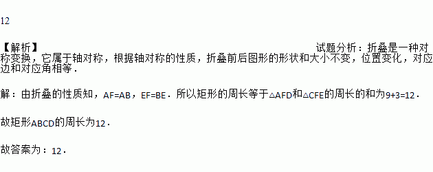 如图所示,将矩形ABCD沿AE向上折叠,使点B落在DC边上的F处,若△AFD的周长为9,△ECF的周长为3,则矩形ABCD的周长为___________.